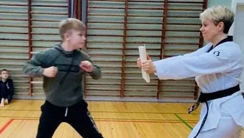 Kampsport: Taekwondo, spark, slag og blokering. Træning af kroppen og smidighed.