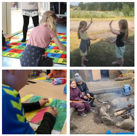 - Udearealer: Sandkasseleg, div. køretøjer, legeplads med udfordrende legeredskaber, gynger, sjippetove, hinkesten, stylter, bolde, basketbaner, ostebaner, hockeybane, fodboldbane og udendørs bordtennis. Derudover har vi et dejligt bålhus.